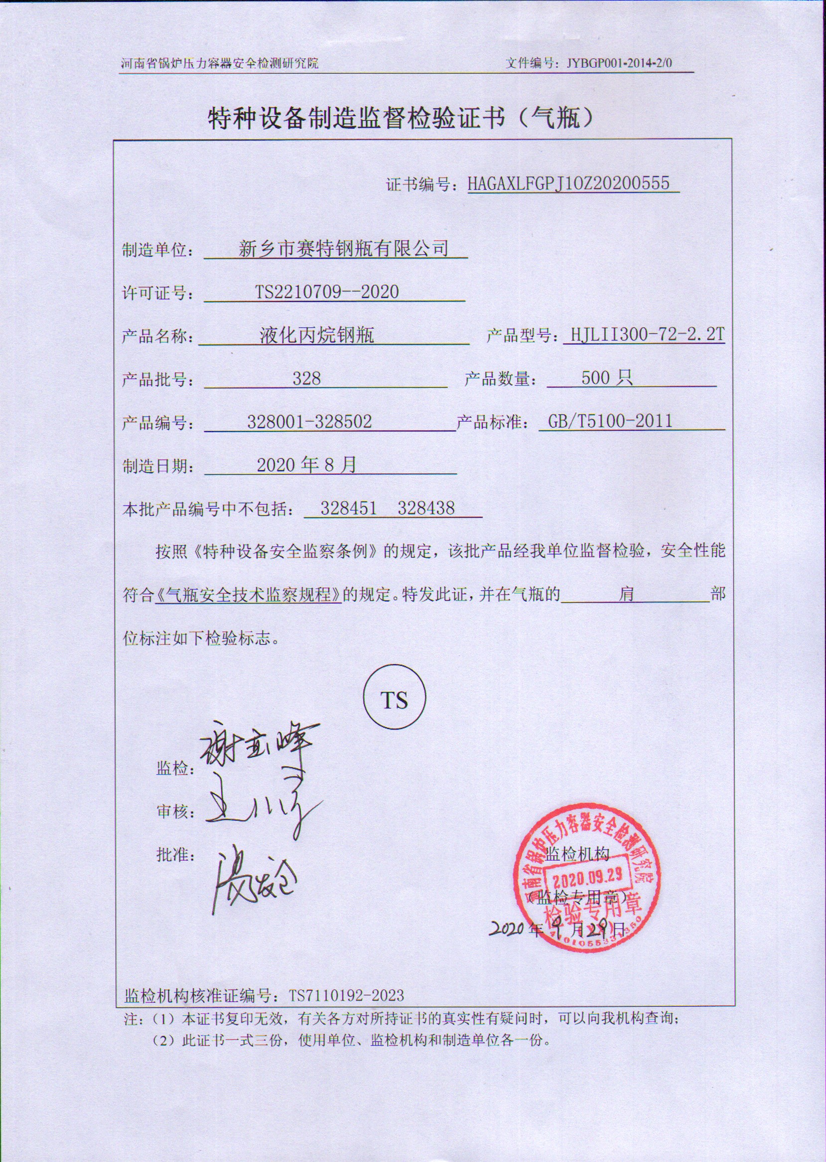 1.特種設(shè)備制造監(jiān)督檢驗(yàn)證書(shū)(氣瓶)